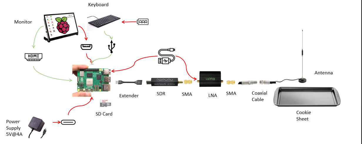 The plan was simple: connect an omnidirectional antenna to a general-purpose LNA, which is connected to a NooElec SDR on the other side, and finally all connected to a Raspberry Pi 5.